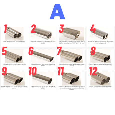 Ab €145,50 EURGrundpreis /Nicht verfügbarAuf LagerEndrohrauswahl für die FMS-Auspuffanlagen / NUR BEIM KAUF DAZU BUCHBAR